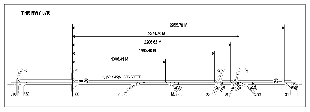 Đường lăn P1 (Một đoạn dài 75,6 M từ mép đường CHC 25R/07L), 44 M, Bê tông xi măng (lề đường lăn: bê tông nhựa), PCN 90/R/B/W/T Đường lăn P1 (Đoạn còn lại dài 280,4 M), 23 M, Bê tông xi măng (lề đường lăn: bê tông nhựa), PCN 61/R/B/X/T Đường lăn P2 (Phần chưa cải tạo, nâng cấp), 23 M, Bê tông xi măng (lề đường lăn: bê tông nhựa), PCN 85/R/B/W/T Đường lăn P2 (Phần đã cải tạo, nâng cấp), 38 M, Bê tông xi măng (lề đường lăn: bê tông nhựa), PCN 90/R/B/W/T Đường lăn P3, 23 M, Bê tông xi măng (lề đường lăn: bê tông nhựa), PCN 90/R/B/W/T Đường lăn P4, 23 M, Bê tông xi măng, PCN 90/R/B/W/T Đường lăn P5 (Một đoạn dài 378,42 M từ mép đường CHC 25R/07L), 29 M, Bê tông xi măng (lề đường lăn: bê tông nhựa), PCN 90/R/B/W/T Đường lăn P5 (Đoạn còn lại dài 76,3 M), 23 M, Bê tông xi măng (lề đường lăn: bê tông nhựa), PCN 61/R/B/X/T Đường lăn P6 (Một đoạn dài 53 M từ mép đường CHC 25R/07L), 29 M, Bê tông xi măng, PCN 90/R/B/W/T Đường lăn P6 (Đoạn còn lại dài 311.2 M), 23 M, Bê tông xi măng, PCN 61/R/B/X/T Đường lăn S (Đoạn từ TWY S1 đến TWY S5), 23 M, Bê tông xi măng, PCN 85/R/B/W/T Đường lăn S (Đoạn từ TWY S5 đến TWY S10), 23 M, Bê tông xi măng, PCN 90/R/B/W/T Đường lăn S1 (Đường lăn nối), 95 M, Bê tông xi măng, PCN 61/R/B/X/T |