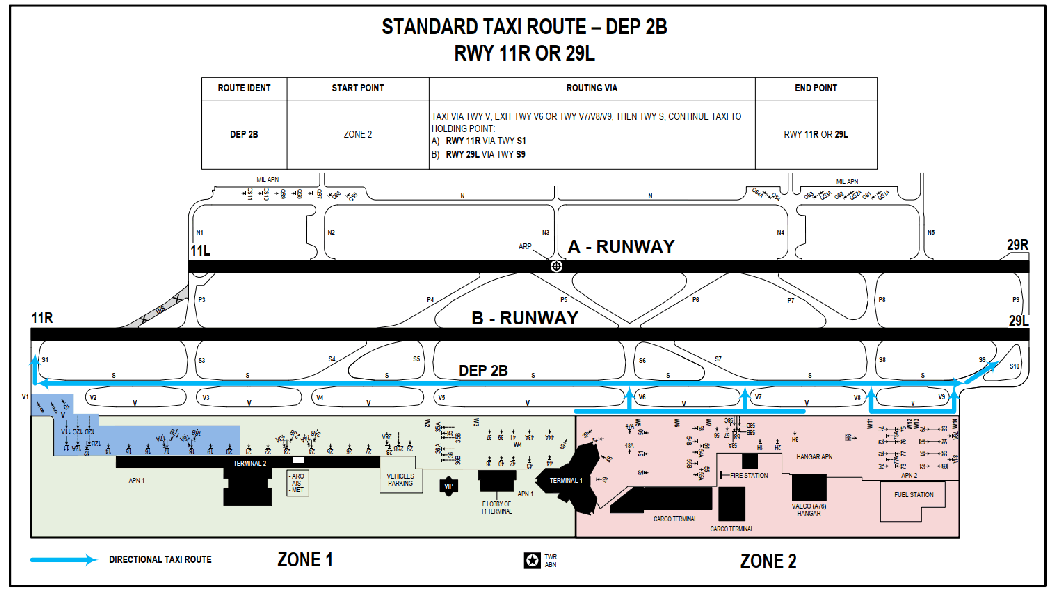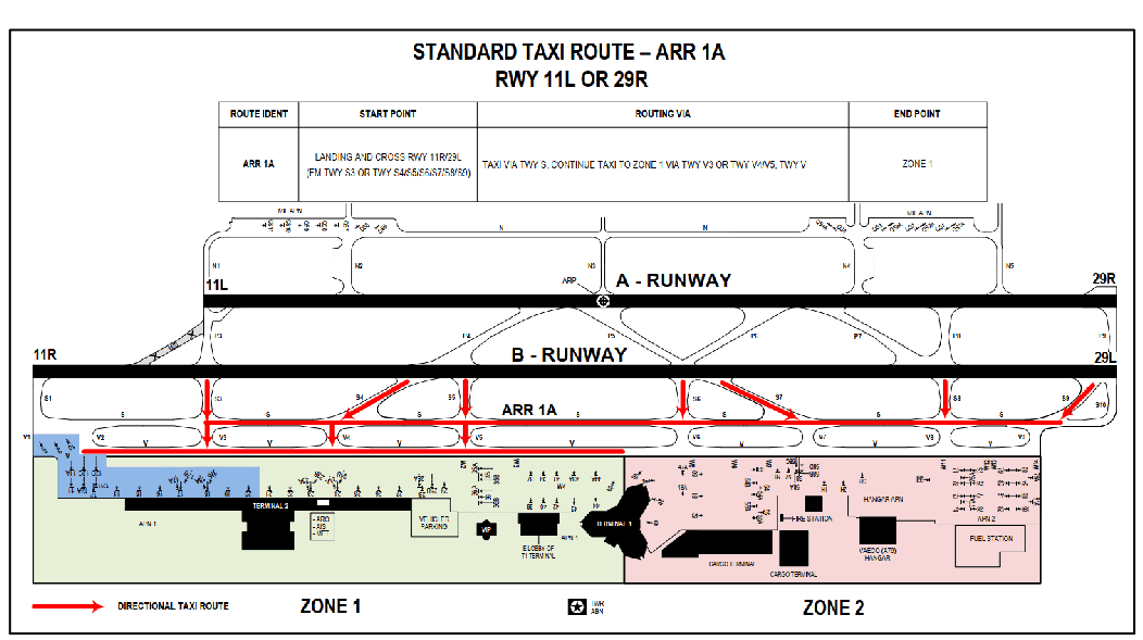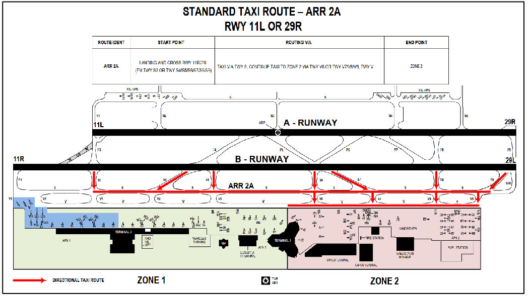 Đường lăn S1, S3, S5, S6, S8: Không sử dụng vạch dừng chờ trung gian phía Bắc đường lăn S khi có tàu bay hoạt động cất cánh và hạ cánh trên đường CHC 11R/29L (do khoảng cách giữa vạch dừng chờ lên đường CHC 11R/29L và vạch dừng chờ trung gian khoảng 41,5 M). Đường lăn S4, S5, S7: Khai thác 1 chiều theo hướng thoát ly đường CHC 11R/29L. Đường lăn S9: Không sử dụng vạch dừng chờ trung gian phía Bắc đường lăn S khi có tàu bay hoạt động cất cánh và hạ cánh trên đường CHC 11R/29L (do khoảng cách giữa vạch dừng chờ lên đường CHC 11R/29L và vạch dừng chờ trung gian khoảng 25 M). Đường lăn S10, V2, V8: Khai thác hai chiều đối với tàu bay code C (sải cánh đến dưới 36 M) và tương đương trở xuống; không được phép khai thác đối với tàu bay code D, E và tương đương trở lên. Đường lăn V1: Đóng cửa 36 M của đường lăn V1 (đoạn từ cách tim đường lăn S về phía Nam là 51 M đến đoạn cách tim đường lăn V về phía Bắc là 11,5 M) để bố trí các vị trí đỗ 8, 9, 10. Tàu bay code D (sải cánh từ 36 M) và tương đương trở lên không được lăn hoặc kéo đẩy qua đường lăn V đoạn từ vị trí đỗ 12 về phía Tây khi vị trí 12C hoặc 12D có tàu bay đỗ. Tàu bay code F (sải cánh từ 68,5 M) và tương đương trở lên chỉ được lăn/kéo đẩy theo các đường lăn V3/V4/V5 để vào vị trí đỗ hoặc khởi hành đối với vị trí đỗ 14, 28 và lăn theo đường lăn V9 để vào vị trí đỗ hoặc khởi hành đối với vị trí đỗ 75A và 79A. |