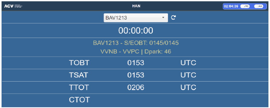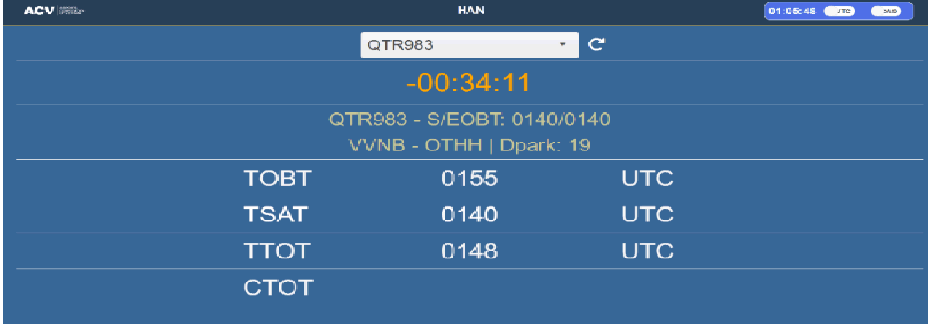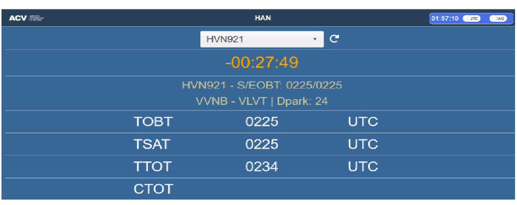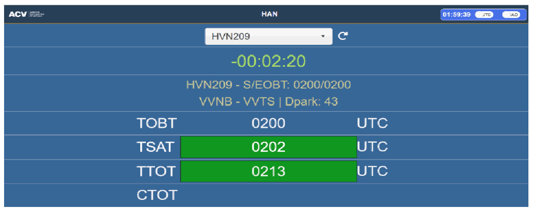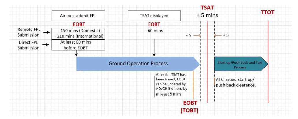 ± 5 phút so với giờ TSAT, tổ lái liên lạc GCU Nội Bài (121.9 MHz) để xin huấn lệnh nổ máy/kéo đẩy (sau khi đã nhận được huấn lệnh đường dài). Nếu quá 5 phút sau khi nhận huấn lệnh, chuyến bay vẫn chưa bắt đầu nổ máy/kéo đẩy do chưa sẵn sàng thì giờ TSAT của chuyến bay đó sẽ bị hủy (trừ trường hợp do điều kiện tàu bay trên sân đỗ) thì KSVKL sẽ không cấp huấn lệnh chấp thuận cho kéo/đẩy nổ máy và yêu cầu tổ lái thông báo cho hãng hàng không, công ty bay/đơn vị phục vụ mặt đất cập nhật giờ TOBT/EOBT mới để nhận TSAT mới.
